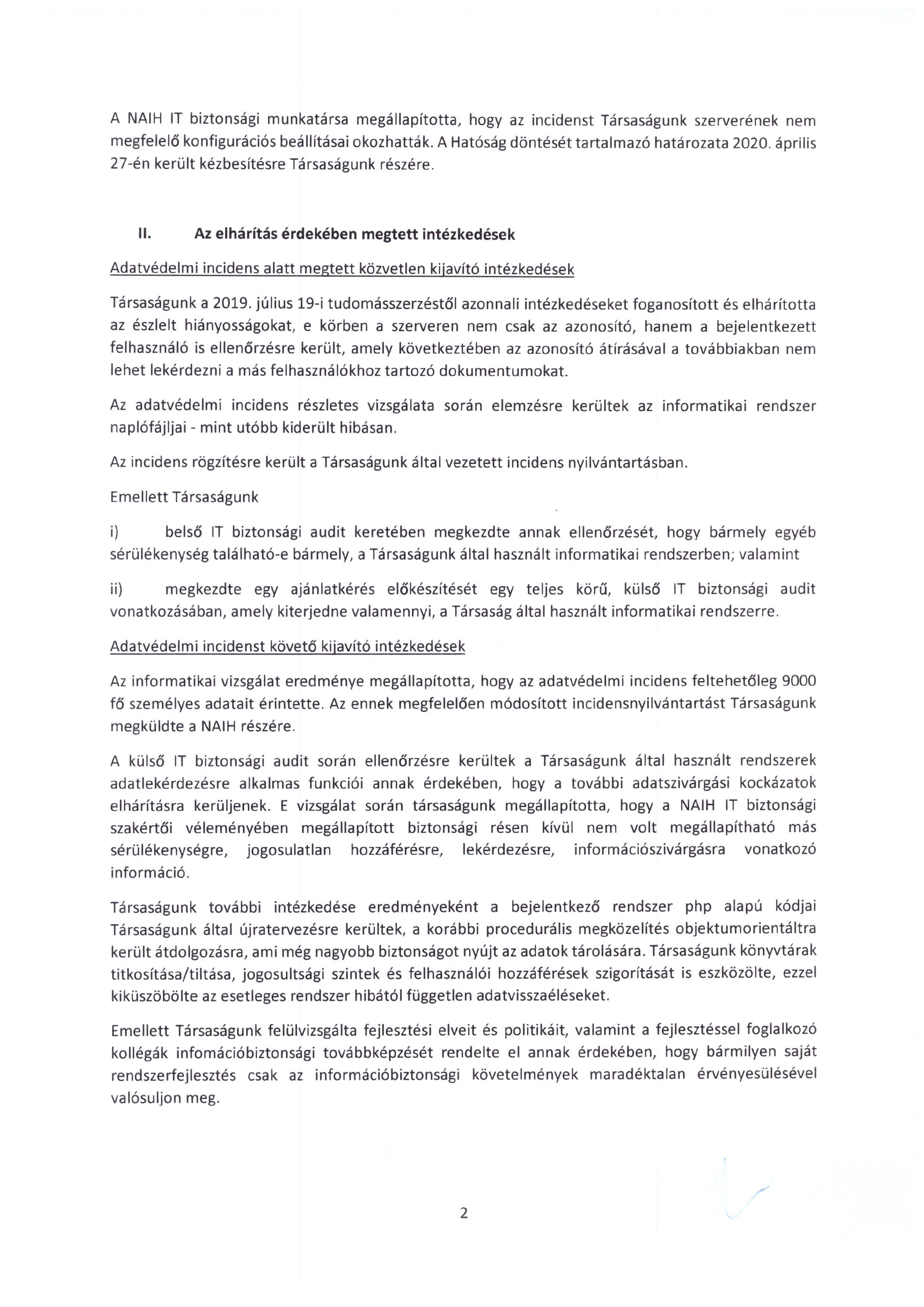 A NAIH IT biztonsági munkatársa megállapította, hogy az incidenst Társaságunk szerverének nem megfelelő konfigurációs beállításai okozhatták. A Hatóság döntését tartalmazó határozata 2020. április 27-én került kézbesítésre Társaságunk részére.