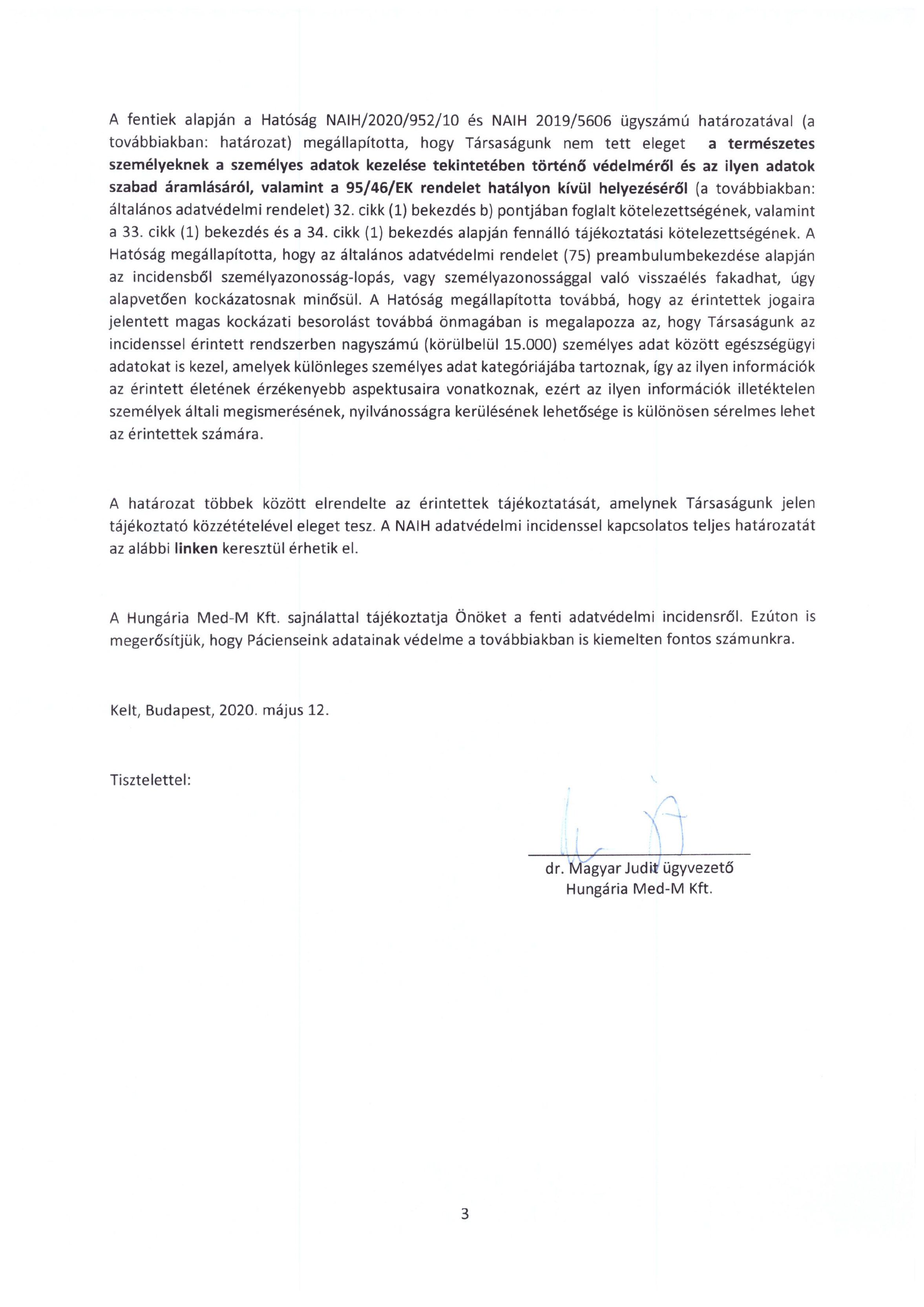 A Hungária Med-M Kft. (székhely: 1132 Budapest, Csanády u. 6. B. ép- V. em. 2.; cégjegyzékszám: 01-09-688789; adószám: 12489477-2-41; nyilvántartó hatóság: Fővárosi Törvényszék Cégbírósága; vezető tisztségviselő: dr. Magyar Judit Katalin) (a továbbiakban: Társaság) ezúton tájékoztatja a Pácienseket (mint érintetteket) az Önök személyes adatait érintő adatvédelmi incidensről.
